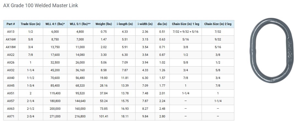 What are the dimensions of the Oblong Master Link for this item? 5/8" x 5 ft Type DOSL 2-Leg Grade 100 Chain Sling - 39100 lbs WLL