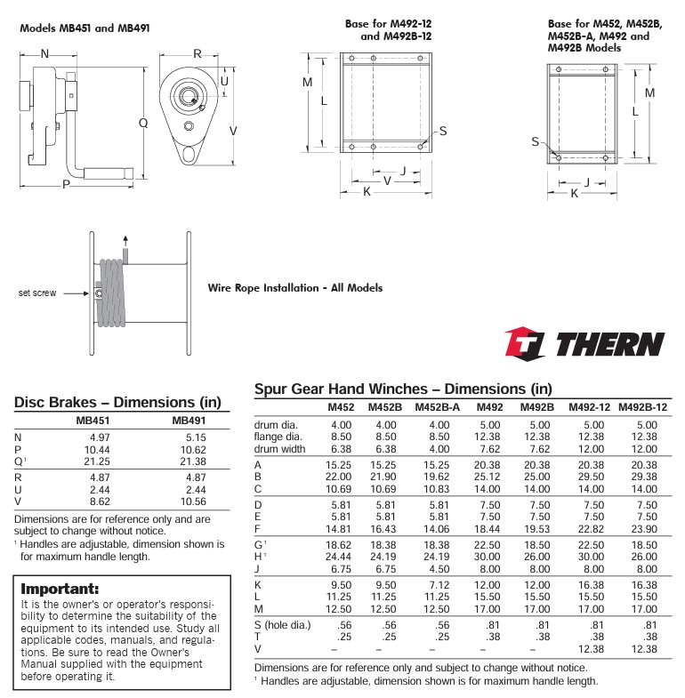 " Thern M492B Spur Gear Hand Winch – 10,000 lb Lifting Capacity \n The Thern M492B spur gear winch is designed for lifting and lowering loads up to 10,000 lbs. Featuring a robust brake system, dual gear ratios, and high-capacity drum storage, it provides safe, efficient performance in heavy-dut...